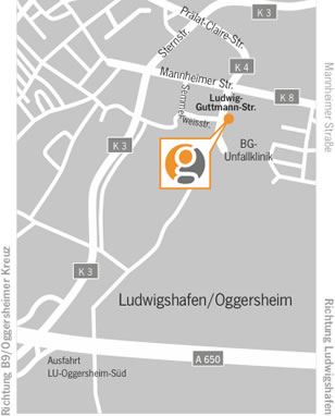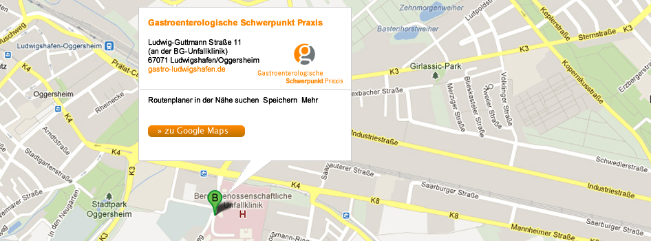 Sie können uns mit dem Auto bequem von derA650 erreichen, wenn Sie „Ludwigshafen- Oggersheim –Süd“ abfahren und der Beschilderung „BG-Unfallklinik“ folgen. Parkplätze finden Sie direkt vor unserer Gastroenterologischen Schwerpunktpraxis.